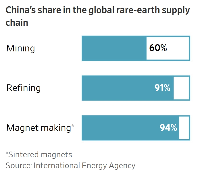 中国在全球稀土供应链中的份额,分别为矿业、精炼、磁铁制作。《华尔街日报》制图